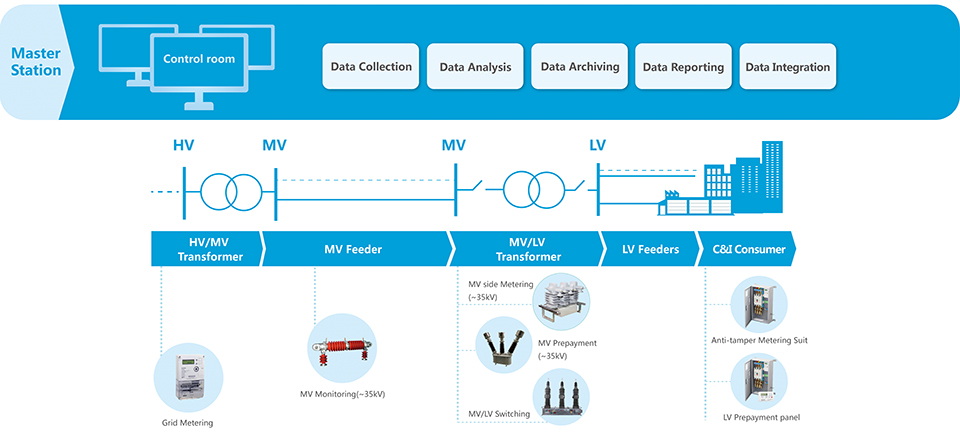 Layer 2- Median Voltage Side: In the MV side, Hexing provides integrated metering solution with combined CT/PT devices. MV metering suit installed at the primary side of transformer makes it difficult for end user to touch and perform any illegal manipulation.
